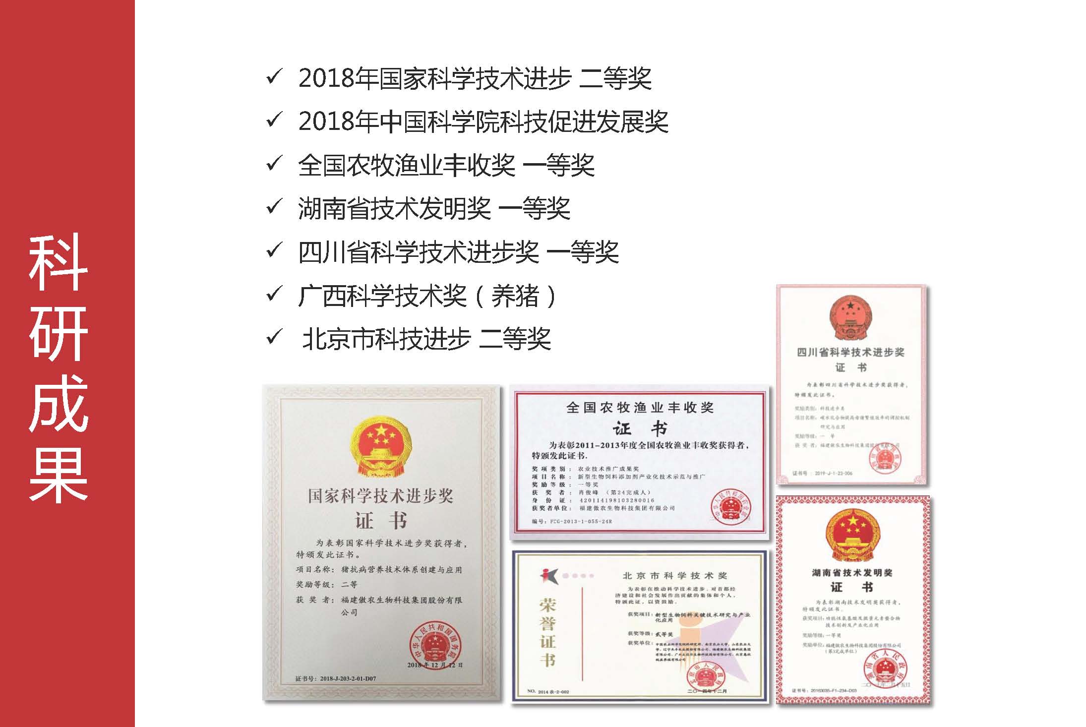 截至目前,集团及下属控股公司共拥有专利468余件(其中发明专利117件、实用新型专利323件、外观专利31件)、计算机软件著作权128件,拥有农业产业化国家重点龙头企业1家、国家生猪核心育种场2家、高新技术企业10家、国家知识产权优势企业3家、省级农业产业化龙头企业13家。公司亦是中国饲料工业协会副会长单位、中国畜牧业协会主席团副主席单位。