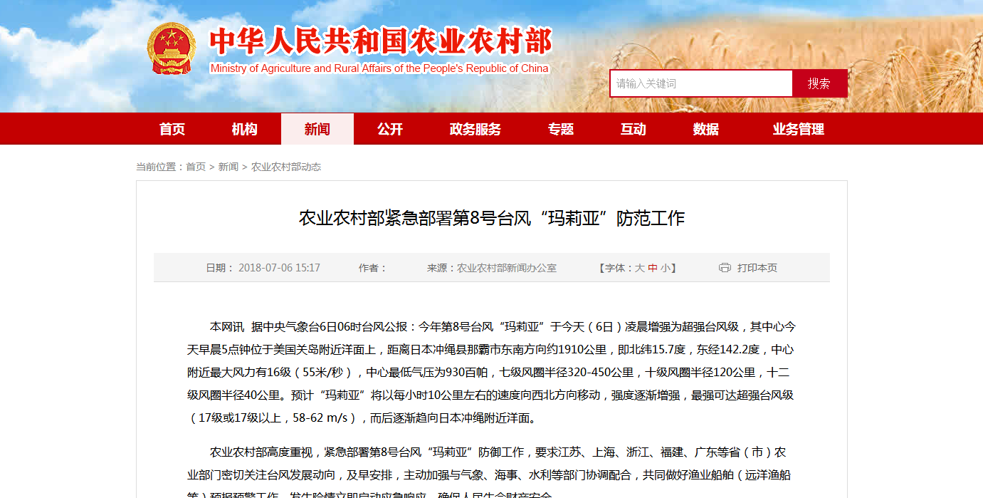 农业农村部已紧急部署第8号台风“玛莉亚”防范工作