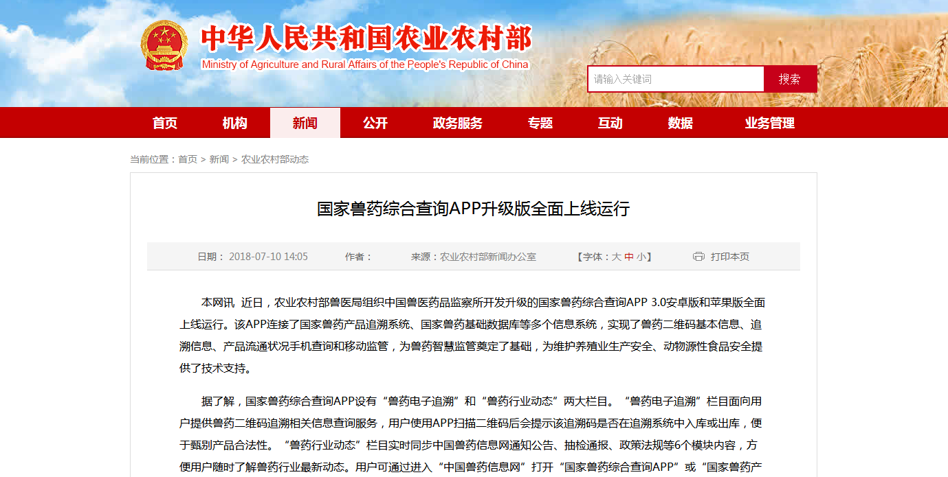 近日,农业农村部兽医局组织中国兽医药品监察所开发升级的国家兽药综合查询APP 3.0安卓版和苹果版全面上线运行。该APP连接了国家兽药产品追溯系统、国家兽药基础数据库等多个信息系统,实现了兽药二维码基本信息、追溯信息、产品流通状况手机查询和移动监管,为兽药智慧监管奠定了基础,为维护养殖业生产安全、动物源性食品安全提供了技术支持。