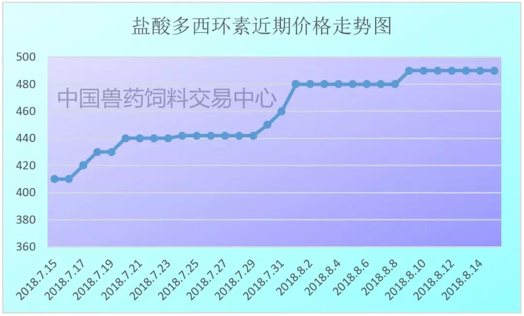 8月15日,盐酸多西环素市场均价约为490元/千克,再创历史新高,与去年最高点相比,涨幅为11.87%。
