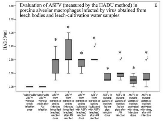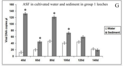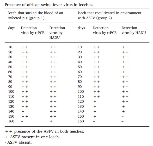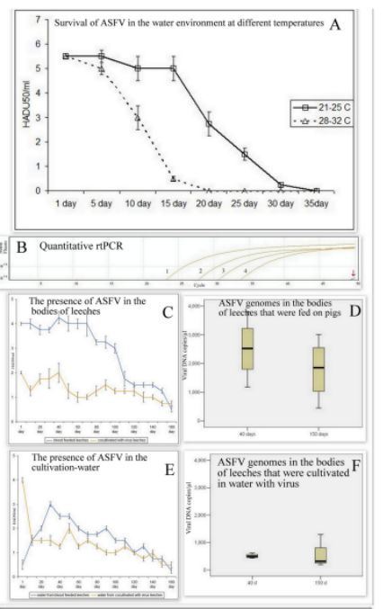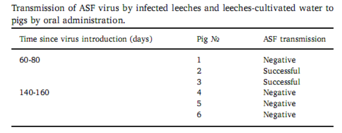 该研究进一步测试了水蛭实验组携带的ASFV是否对猪具有感染能力,结果表明水蛭携带的ASFV通过口服途径感染猪是可能的,但是这种现象不能被有规律的重复,特别是在实验的后期阶段。从口服感染到发病,猪的潜伏期为12-15天,这与临床数据非常相似。