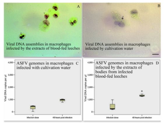 为了测试水蛭携带ASFV的感染能力,培养130-160天后,该研究用水蛭实验组的培养液、水蛭提取物的10倍稀释液对猪原代肺泡巨噬细胞进行感染。HADU和PCR结果均显示,接种后24-48 h病毒滴度明显增加。