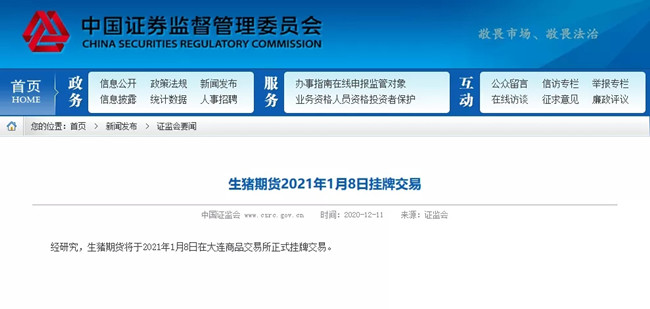 12月11日,证监会发布公告,生猪期货将于2021年1月8日在大连商品交易所(下称大商所)正式挂牌交易。这是期货市场落实推进资本要素市场化配置,增加有效金融服务供给的新举措,也是资本市场发挥中枢作用,更加有效服务实体经济的具体体现。生猪是我国价值最大的农副产品,生猪期货将是我国期货市场上市的第一个活体交割品种。业内人士认为,生猪期货将在稳定价格预期、助力产业规模化发展、助力精准扶贫等方面发挥积极作用。
