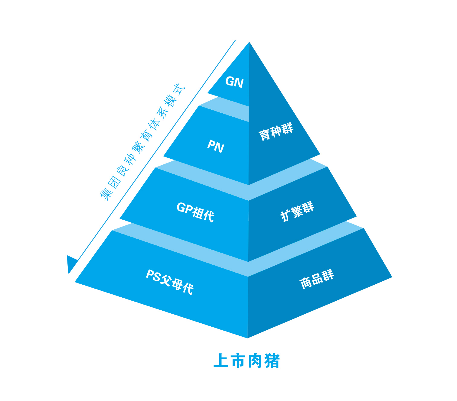 集团采用育种与生产核心群(GN群、PN群)、扩繁群、商品群三级金字塔式良种猪繁育体系模式。